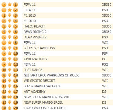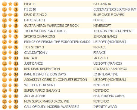 Гоночный симулятор F1 2010 опустился на второе место, Dead Rising 2 остался на третьем, а Halo: Reach переместился со второй на четвертую позицию. Sports Champions для Move продолжает неплохо продаваться, но плавно продвигается по направлению к вылету из десятки лидеров.