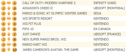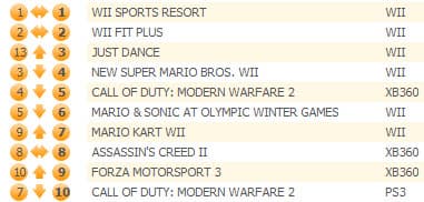 Chart Track делает акцент на том, что за последние пять лет только Need for Speed: Underground 2 удалось продержаться на первом месте так же долго. Assassin's Creed II вернулась на вторую строчку, а Mario & Sonic at the Olympic Winter Games - на третью.