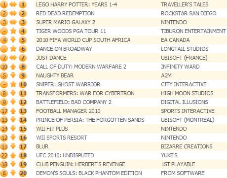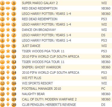 Продажи Lego Harry Potter: Years 1-4 снизились всего на 14%, Red Dead Redemption также продолжает держаться молодцом (-18%), Super Mario Galaxy 2 сбавил темпы продаж на 29%.