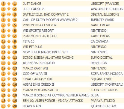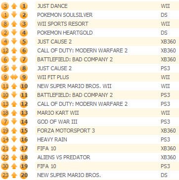 Продажи Just Cause 2 снизились незначительно (-21%), игра опустилась на вторую строчку. Battlefield: Bad Company 2 осталась на своей третьей позиции, а Call of Duty: Modern Warfare 2 вернулась в пятерку лидеров впервые за пять недель.
