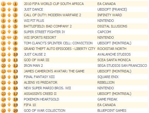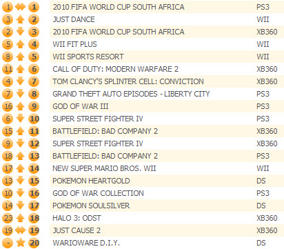 Футбольный симулятор 2010 FIFA World Cup South Africa, несмотря на 34% снижение продаж, остался на первой позиции. Танцевальная игра Just Dance поднялась на вторую строчку, а суммарные продажи игры в регионе уже превысили 1 млн. копий.