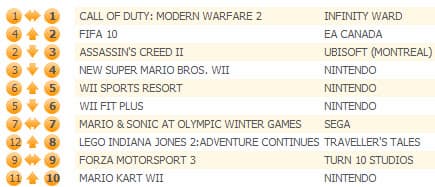 Продажи FIFA 10 выросли на 24%, и игре удалось подняться на вторую позицию в суммарном зачете, обойдя Assassin's Creed II. Можно вспомнить, что в прошлом году Call of Duty: World at War удалось продержаться на вершине пять недель подряд, прежде чем ее скинула FIFA 09.