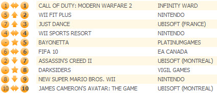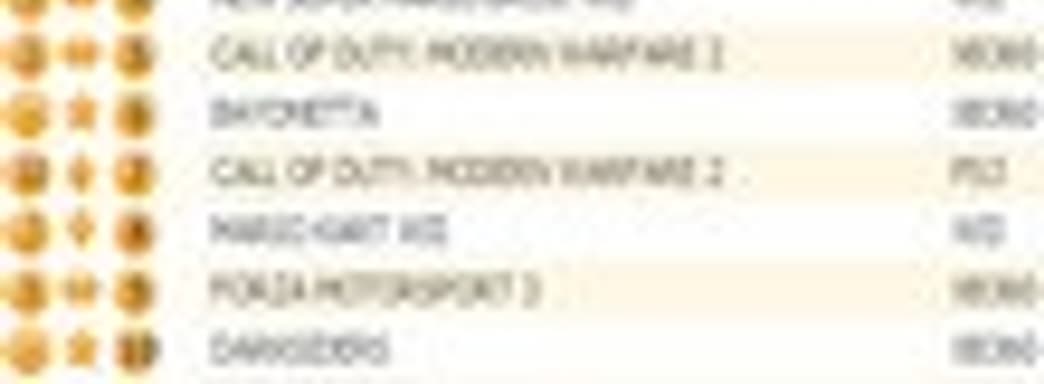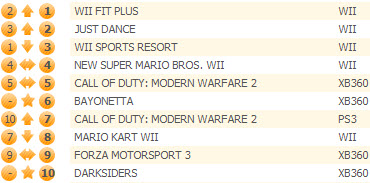 На этой неделе в десятке два новичка: Bayonetta с первой попытки смогла занять лишь 5 строчку, а Darksiders дебютировала на восьмой строчке британского хит-парада.