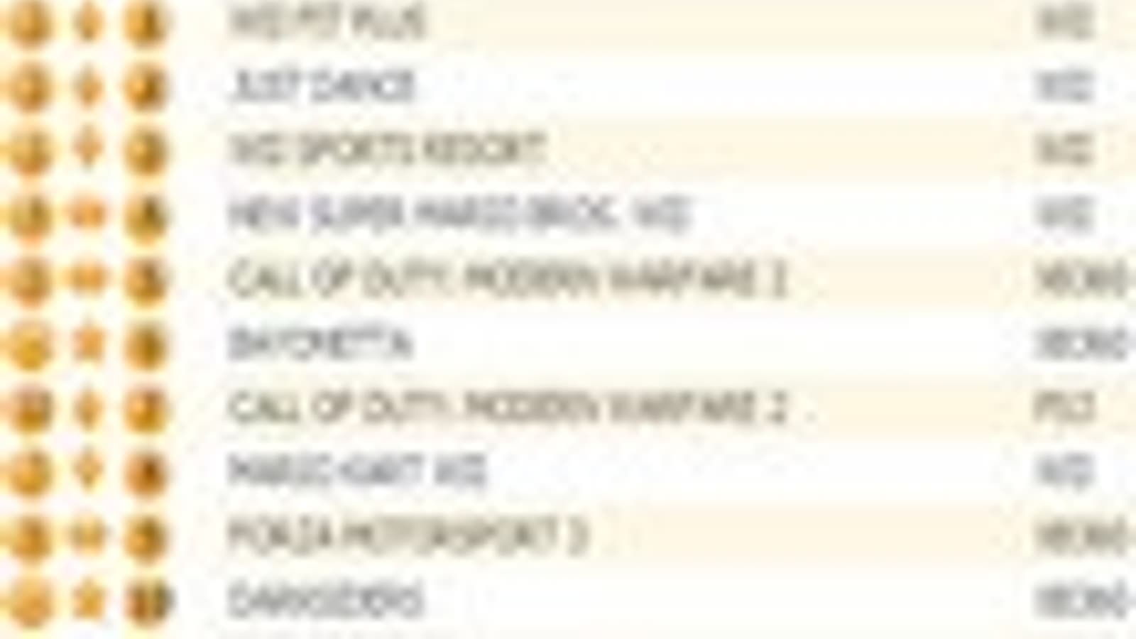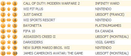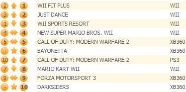 Продажи Wii Fit Plus снизились на 42%, однако это не помешало игре подняться с пятого на второе место. Just Dance также ухудшила свои показатели на 41%, при этом игра смогла подняться на третью строчку с седьмой. Wii Sports Resort осталась на четвертой позиции.