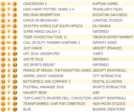 Lego Harry Potter: Years 1-4 и Red Dead Redemption переместились, соответственно, на второе и третье места. Продажи Dance on Broadway улучшились почти вдвое, а игра заняла четвертую строку. Super Mario Galaxy 2, наоборот, сбавил темпы, опустившись с третьего на шестое место.