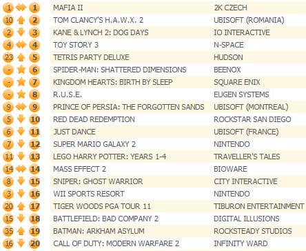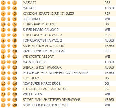 Третью неделю подряд на первой позиции удерживается Mafia II, причем, если рассматривать отдельно продажи для каждой платформы, то версия для PS3 обошла издание для Xbox 360.