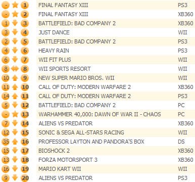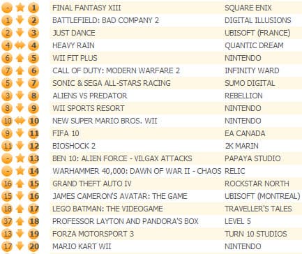 Продажи Battlefield: Bad Company 2 снизились на 38%, а Just Dance на 9% - эти игры переместились на вторую и третью строчку, соответственно. Heavy Rain продается очень и очень стабильно - потеряв всего 8% продаж, по сравнению с прошлой неделей, игра осталась на четвертой позиции.
