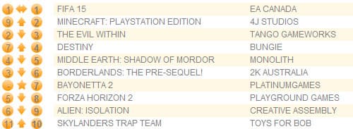 Футбольный симулятор FIFA 15 удерживается на первом месте вот уже пятую неделю подряд - больше, чем какая-либо другая игра в этом году. Суммарно игры ЕА занимали первое место в британском чарте в этом году уже 18 из 43 недель, а в прошлом году - всего 10. Minecraft: Playstation Edition рванула на второе место, благодаря успеху версии для PS4.