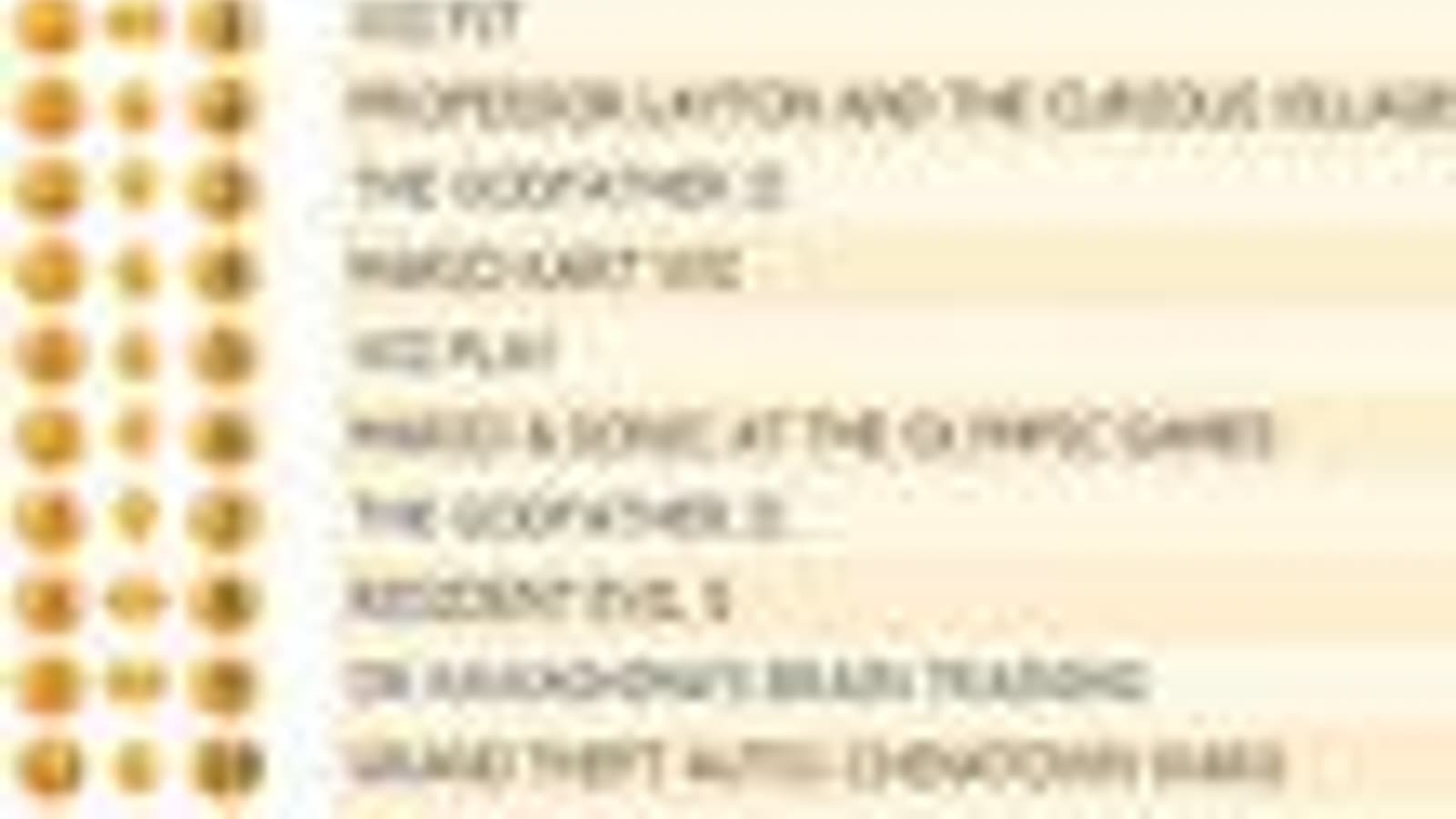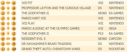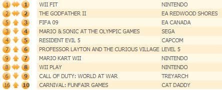 Продажи Resident Evil 5 снизились еще на 30%, а игра опустилась на пятую строчку. Mario Kart Wii была самой стабильной игрой на прошлой неделе (-1%), поднявшись на две строки вверх.