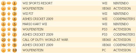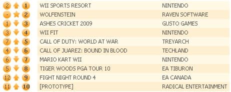 Call of Duty: World at War поднялся с седьмого на пятое место, Call of Juarez: Bound in Blood опустился на шестую строку, а Prototype вновь вернулся в десятку.
