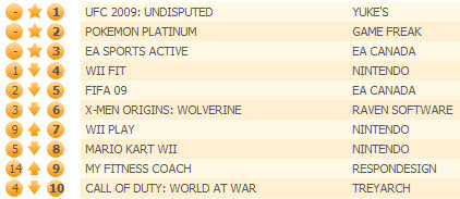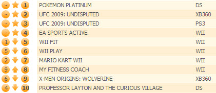 Лидером на прошлой неделе стал симулятор боев mixed martial arts UFC 2009: Undisputed, причем разделение между платформами примерно одинаковое - 52% копий для Xbox 360 и 48% для PS3. Pokemon Platinum, наконец, вышла в Европе, заняв вторую строчку хит-парада.