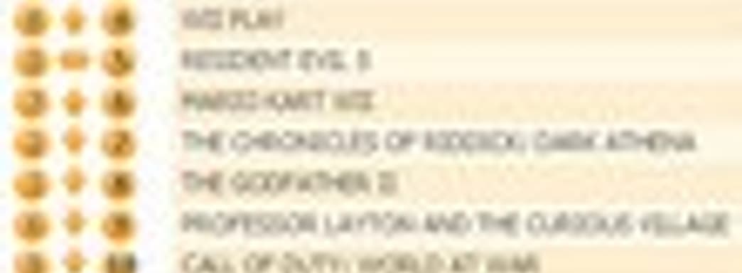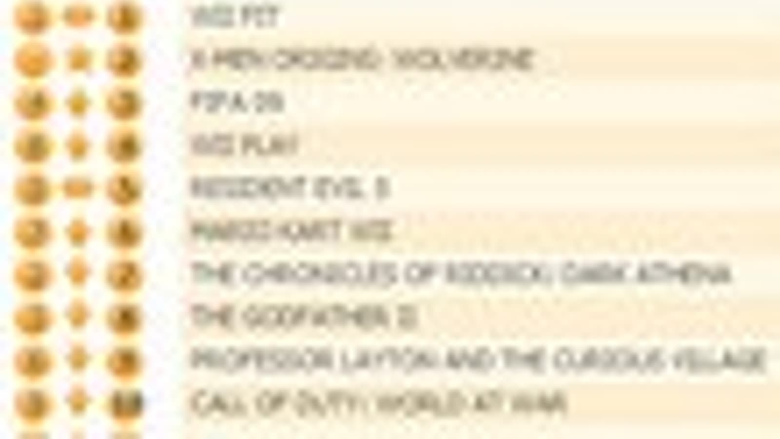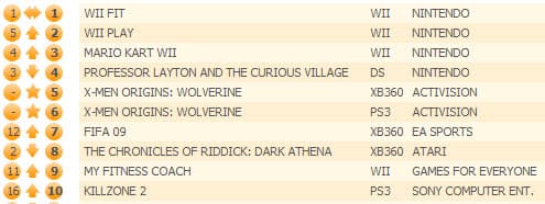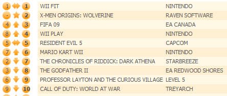 Fifa 09 улучшила свои результаты на целых 28% поднявшись на третье место, а на четвертой строчке оказался сборник Wii Play (+47%), который перескочил туда с восьмой позиции. Вообще, все игры для консолей Nintendo на прошлой неделе чувствовали себя себя очень хорошо, взять ту же Mario Kart Wii (+15%). Resident Evil 5 продолжает удерживаться в середине чарта, находясь в десятке уже восемь недель с момента релиза.