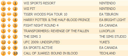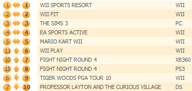 На второй неделе после релиза Wii Sports Resort показатели продаж не только не снизились, но и выросли на 6%. Демонстрируя удивительную живучесть, с четвертого на второе место переместился фитнесс-сборник Wii Fit. Места с третьего по пятой достались играм издательства ЕА: Tiger Woods PGA Tour 10 удерживает бронзу, Harry Potter & The Half-Blood Prince опустился на четвертую строчку, а Fight Night Round поднялся на одну позицию вверх.