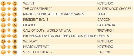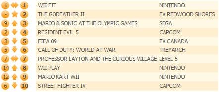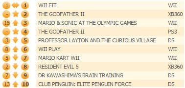 Новичок прошлой недели The Godfather II, несмотря на скептические прогнозы, занял вторую строчку хит-парада. Mario & Sonic at the Olympic Games совершила очередной рекордный скачок, поднявшись с девятого на третье место.