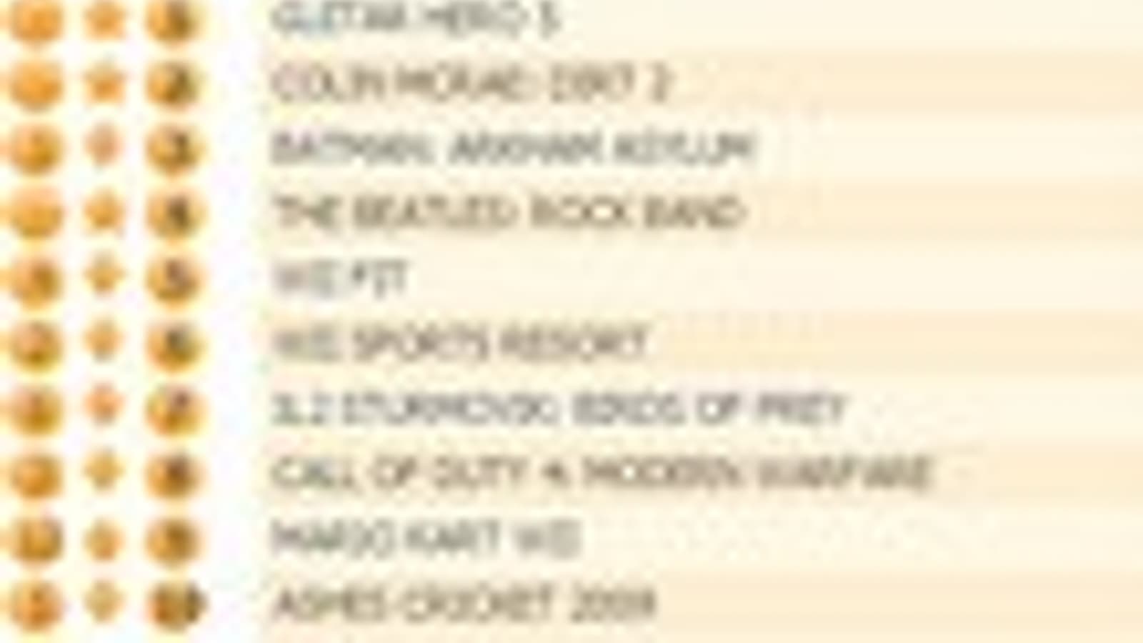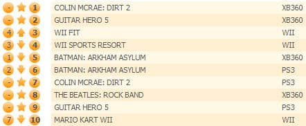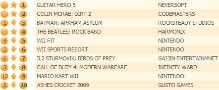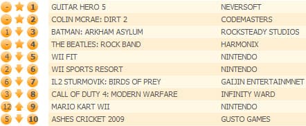 На втором месте оказались новые гонки Colin McRae: Dirt 2, а лидер позапрошлой недели Batman: Arkham Assylum смог взять в этот раз лишь бронзу. The Beatles: Rock Band - еще одна новинка - смогла подняться лишь на четвертую позицию, однако и это является самым лучшим достижением для данной серии.