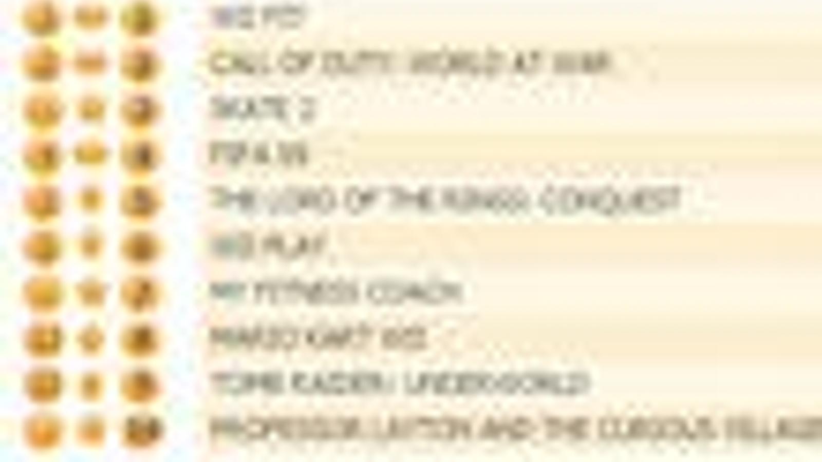 Call of Duty World at War также не собирается сдавать позиции, следуя путем, который был проложен предыдущей игрой серии - второе место. В прошлый раз бронзу забрал Lord of the Rings: Conquest, который в этот раз переместился на пятое место, отдав третью позицию симулятору скейтборда Skate 2.