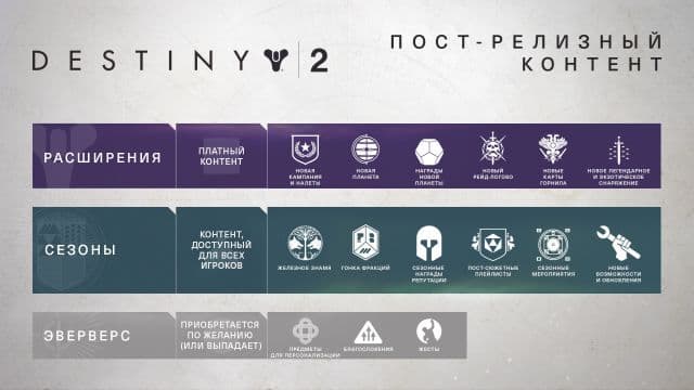 - Расширения – приобретаются отдельно, содержат новую кампанию, планеты, рейды, карты и снаряжение.