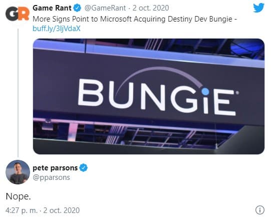 В середине сентября благодаря подкасту Games Beat в сети появлялись слухи о том, что Microsoft пытается приобрести Bungie, но они были опровергнуты представителями студии. Вчера президент Пит Парсонс повторил уже сказанное.