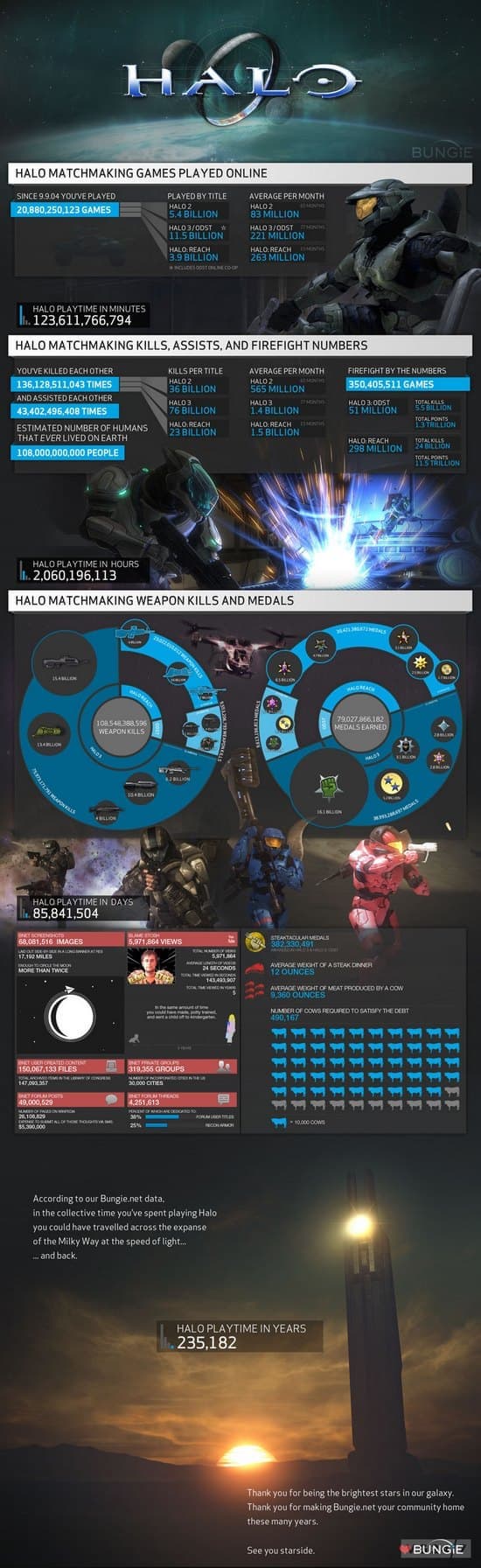 Также разработчики опубликовали интересную статистику, из которой может почерпнуть следующие детали: за 8 лет поклонники серии сыграли в мультиплеере более 20 млрд. матчей, из них больше всего (11,5 млрд.) пришлось на Halo 3 и ODST. Суммарное игровое время составило около 235 тыс. лет.