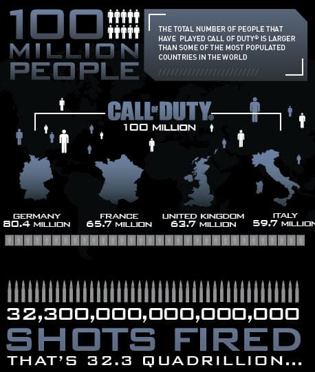 Издатель утверждает, что всего игры серии Call of Duty опробовали более 100 млн. человек, которые суммарно провели за играми 25 млрд. часов - выходит, что каждый пользователь наиграл в среднем не меньше 250 часов, а в это верится с трудом. Конечно, есть большие фанаты, проводящие сотни часов в мультиплеере, но среди вышеупомянутых 100 млн. человек немало тех, кто запустил игру один раз и не вернулся к ней.