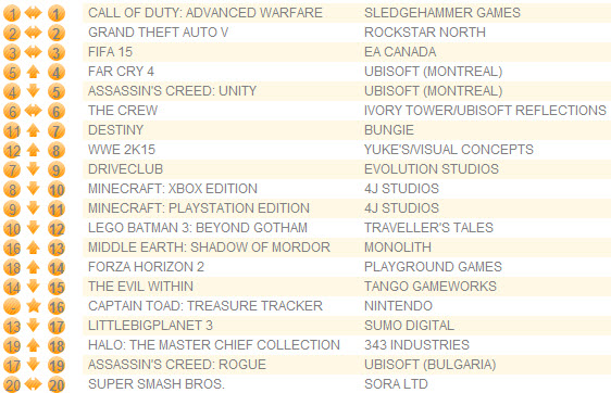 Тройка лидеров в первую неделю 2015 года осталась неизменной, лидером вновь стал шутер Call of Duty: Advanced Warfare (в шестой раз с момента релиза, опередив в этом плане Call of Duty: Ghosts). Второе и третье места вновь заняли Grand Theft Auto V и FIFA 15, соответственно.