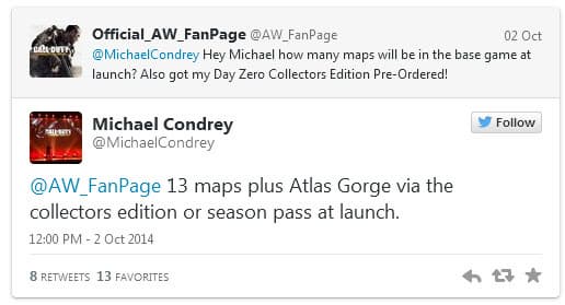 Отвечая на вопрос о количестве мультиплеерных карт в новому шутере от первого лица в Call of Duty: Advanced Warfare, Майкл Кондри (Michael Condrey), операционный директор Sledgehammer Games, ответил следующее: