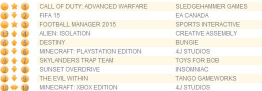 Новый шутер от первого лица Call of Duty: Advanced Warfare прервал победное шествие футбольного симулятора FIFA 15, которое продолжалось в течение последних шести недель. Что касается Call of Duty: Advanced Warfare, то игра продемонстрировала пятый в истории серии старт, но все же смогла улучшить прошлогодный результат Call of Duty: Ghosts. И еще одно сравнение: Call of Duty: Advanced Warfare за первую неделю продалась на 14% лучше, чем Titanfall, Destiny и Wolfenstein суммарно, а эти игры продемонстрировали одни из лучщих стартов в этом году.