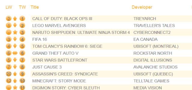 Лидерство вновь захватил шутер Call of Duty: Black Ops 3. Lego Marvel Avengers опустилась на вторую строчку, продажи игры упали на 41%. Файтинг Naruto Shippuden: Ultimate Ninja Storm 4 дебютировал на третьем месте. Это второй показатель за всю историю франшизы. Лучше четвертой части стартовала только третья в 2013 году на PS3 и Xbox 360.