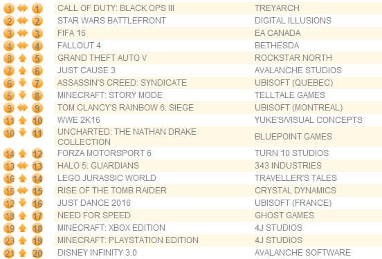 Первые четыре позиции не изменились, лидером остается Call of Duty: Black Ops III, продажи которого улучшились на 40%. Продажи Star Wars Battlefront, которая занимает второе место, выросли на 16%, FIFA 16 - на 20%, а Fallout 4 - на 13%.