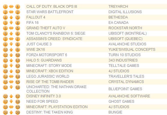 Лидером на последней неделе прошлого года был шутер Call of Duty: Black Ops III, второе место вновь досталось Star Wars Battlefront, а третью позицию отвоевала ролевая игра Fallout 4. Футбольный симулятор FIFA 16 вернулся на четвертую строчку.