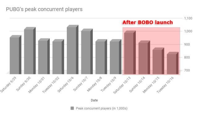 В течение первых двух дней после релиза Black Ops IIII, состоявшегося 12 октября, пользовательская база PUBG уменьшилась незначительно. За субботу и воскресенье количество одновременно играющих в PUBG пользователей снизилось на 6,5% по сравнению с 6-7 октября. Подобные изменения имели место и раньше.