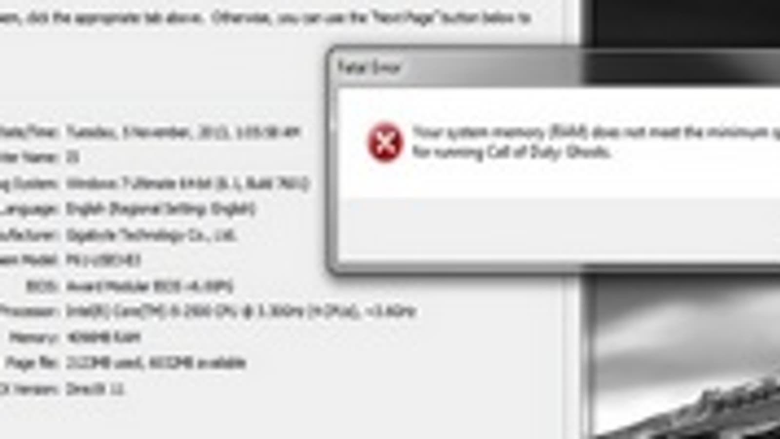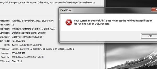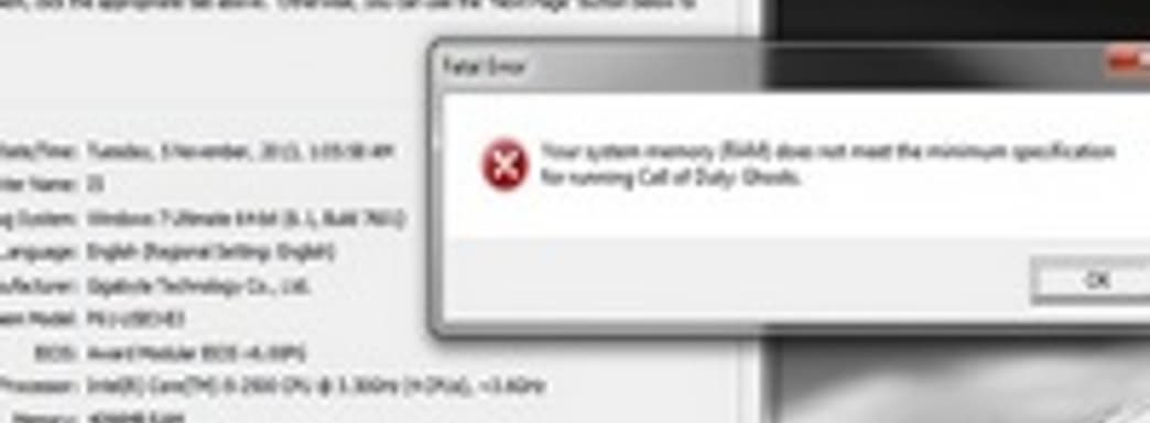 Напомним, компьютерной версии Call of Duty: Ghosts требуется для запуска не меньше 6 ГБ оперативной памяти и 40 ГБ места на винчестере. Если в вашем компьютере установлено 4 ГБ оперативной памяти, то игра просто не запустится со следующим сообщением.