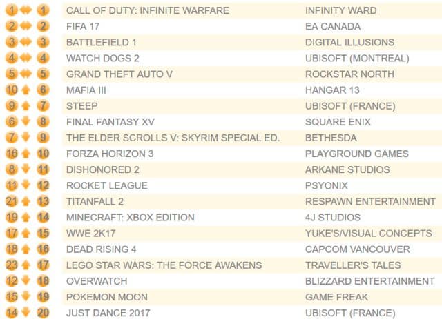 Компания Chart-track опубликовала свежие данные о продажах игр на территории Соединённого королевства. Уже третью неделю подряд лидерство удерживает шутер Call of Duty: Infinite Warfare. На втором месте остался футбольный симулятор FIFA 17, на третьей строчке опять расположился шутер Battlefield 1.