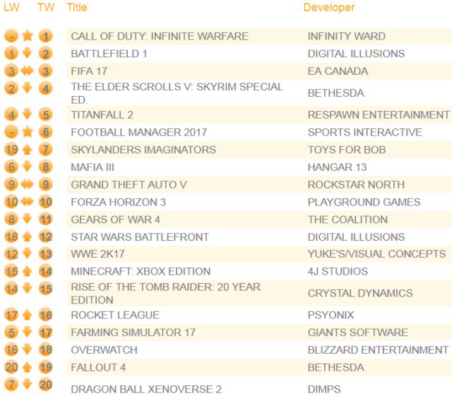 Шутер Battlefield 1 опустился на второе место, а продажи игры упали на 45%. На третьем месте остался FIFA 17 (-11%). Переиздание Skyrim опустилось со второй на четвёртую строчку (-53%). Titanfall 2 опустился с четвёртой на пятую позицию, продажи игры упали на 41%. С шестого места стартовал Football Manager 2017.