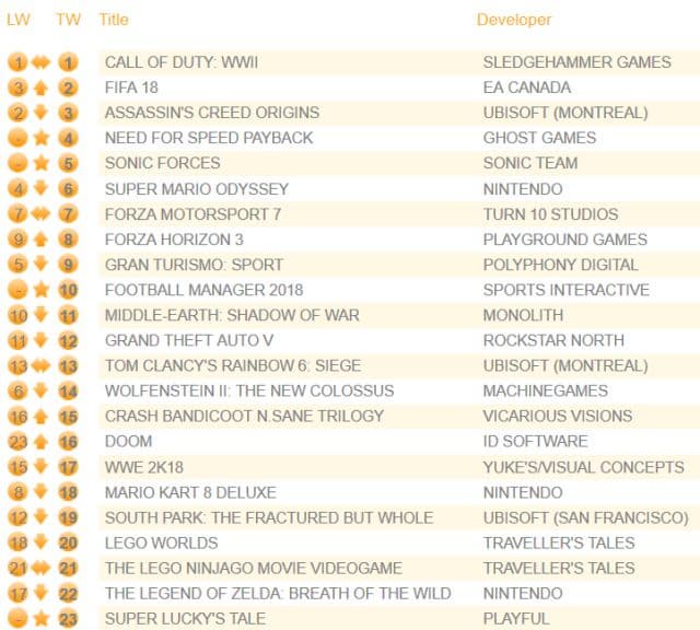 Компания Chart-track опубликовала свежие данные о продажах игр на территории Соединённого королевства. На первом месте остался шутер Call of Duty: WWII, продажи которого снизились всего на 43% по сравнению с предыдущей неделей.