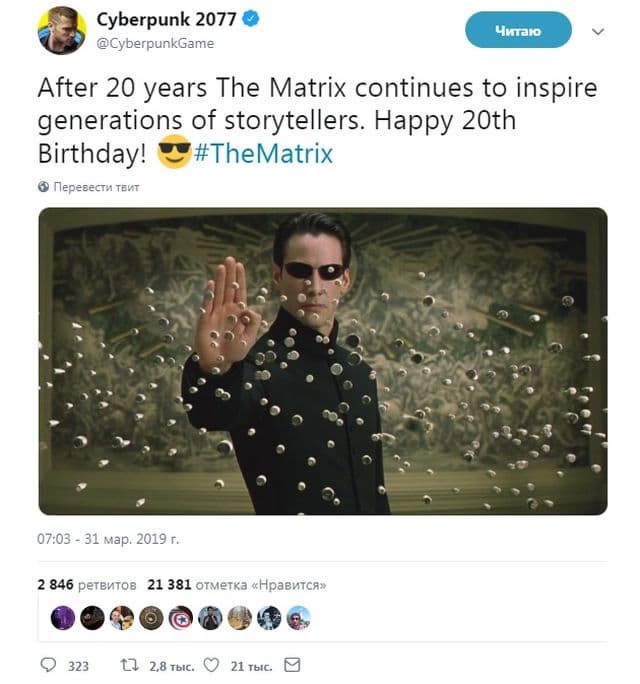 Кеану Ривз, объявивший дату выхода Cyberpunk 2077 на конференции Microsoft на E3 2019, стал неожиданностью и приятным сюрпризом для фанатов. Но, как оказалось, CD Projekt Red ранее намекала на появление актёра в игре. 31 марта разработчики в официальном аккаунте в твиттере поздравили фильм «Матрица» с 20-летием.