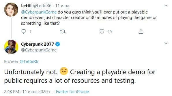 Разработчики Cyberpunk 2077 подтвердили, что не планируют выпускать демо-версию проекта. Один из пользователей твиттера поинтересовался у создателей, стоит ли ждать хотя бы небольшую демо-версию с редактором персонажа или возможностью провести в игре минут 30.