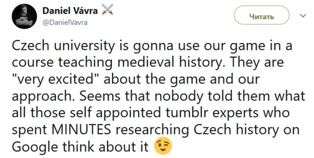 «Чешский университет собирается использовать нашу игру в учебной программе про историю средневековья. Им “очень интересна” наша игра и наш подход. Похоже, им никто не рассказал о том, что об этом думают самопровозглашённые эксперты из Tumblr, которые изучали историю Чехии с помощью Google в течение нескольких минут», - заявил Даниэль Вавра.