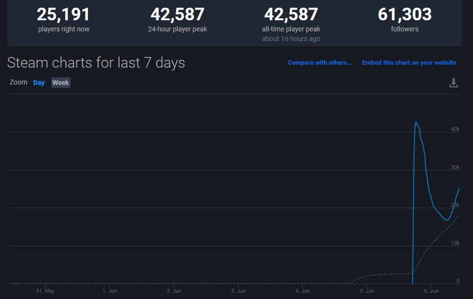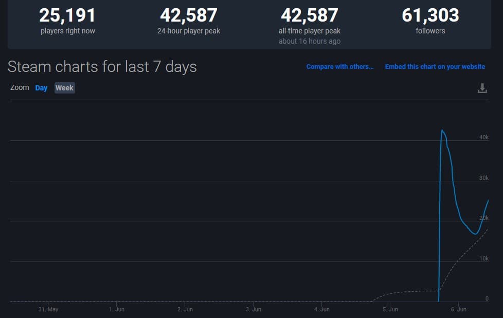 На момент публикации новости в проекте находится более 25 тысяч игроков, и оценка после 3100 отзывов составляет 91% положительных обзоров. Количество отзывов быстро растёт.