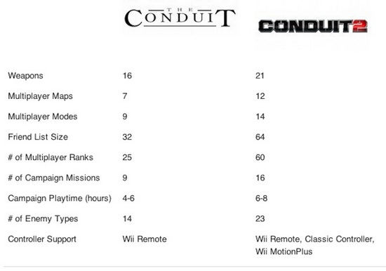 Компания High Voltage опубликовала картинку, которая демонстрирует численную разницу между шутером Conduit 2 и оригинальной игрой. Например, количество видоs оружия было увеличено с 16 до 21.