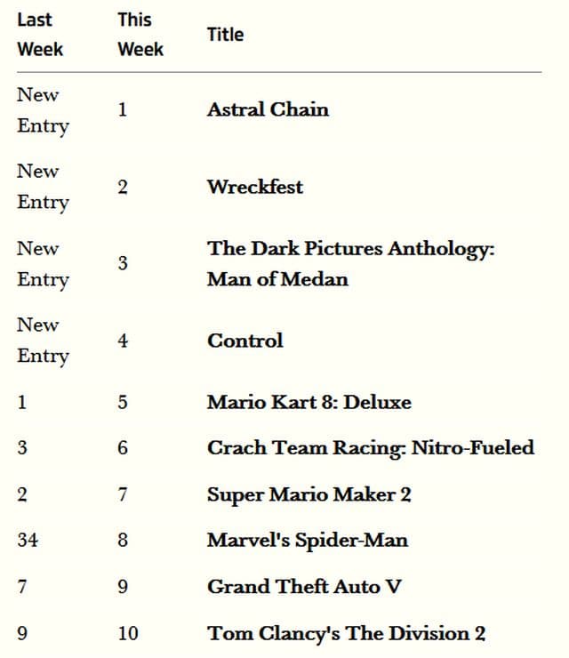 На первой строчке дебютировал приключенческий боевик Astral Chain для Switch от студии PlatinumGames. В списке самых успешных стартов проектов от «Платиновой» студии Astral Chain занимает четвёртое место. Это второй самый успешный запуск проекта по новой интеллектуальной собственности от PlatinumGames после Bayonetta, вышедшей январе 2010 года.
