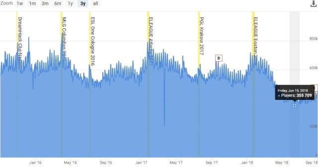 Стоит отметить, что популярность Counter-Strike: Global Offensive в Steam за последний год значительно снизилась. Падение началось в апреле и продолжалось в течение летнего периода. В прошлые годы самым низким онлайном лета были 480-500 тысяч игроков. В этом сезоне нижней планкой стало количество в 355-380 тысяч постоянных пользователей. С приходом сентября, по понятным причинам пик игроков вырос, но пока незначительно.