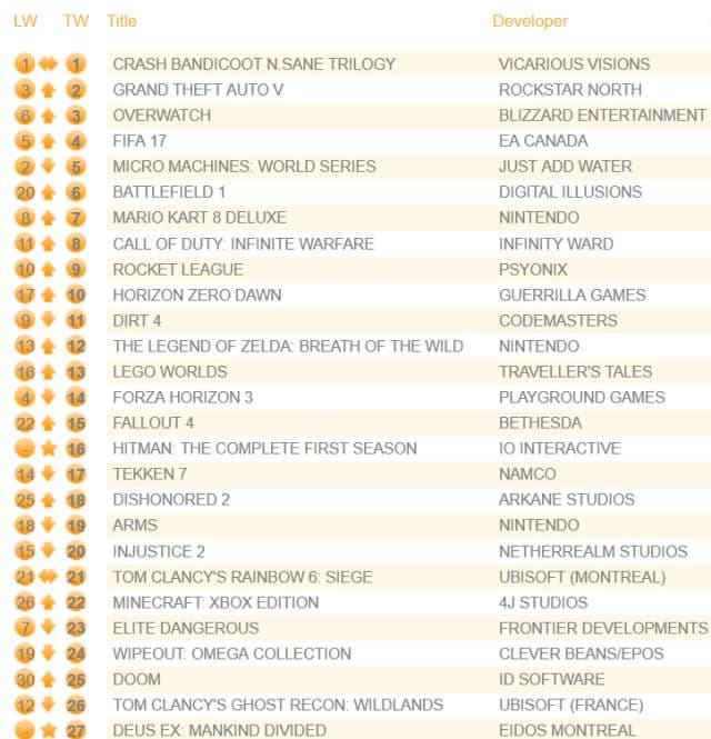 Компания Chart-track опубликовала свежие данные о продажах игр на территории Соединённого королевства. Хотя продажи Crash Bandicoot N.sane Trilogy упали на 78% по сравнению с предыдущей неделей, это не помешало проекту остаться на первом месте чарта.