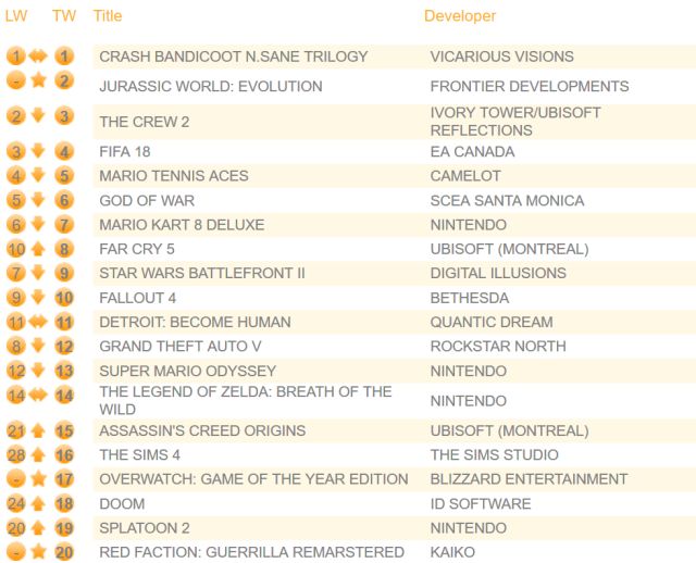 На втором месте дебютировало дисковое издание стратегии Jurassic World: Evolution для PS4 и Xbox One (PC-версия доступна в только в цифровом виде). Если учитывать доход от продаж, а не количество проданных копий, то дисковая версия Jurassic World: Evolution станет самой успешной игрой в Британии за прошлую неделю. Дело в том, что Jurassic World: Evolution продаётся за полную стоимость, а Crash Bandicoot: N.Sane Trilogy – за бюджетную стоимость.