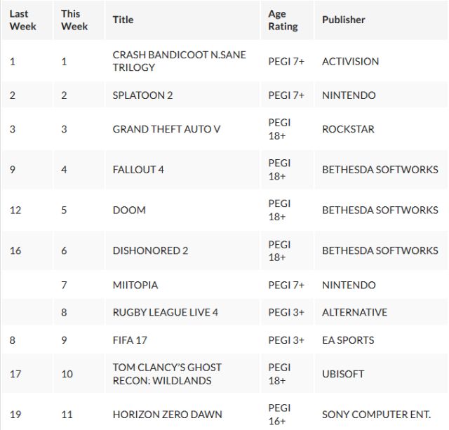 Компания Chart-track опубликовала свежие данные о продажах игр на территории соединённого королевства. В условиях отсутствия новых громких релизов тройка лидеров осталась неизменной. На первом месте располагается сборник Crash Bandicoot N.Sane Trilogy, на втором – красочный боевик Splatoon 2, а на третьем - Grand Theft Auto V.