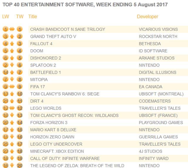 Компания Chart-track опубликовала свежие данные о продажах игр на территории Соединённого королевства. В условиях отсутствия новых релизов на первом месте остался сборник Crash Bandicoot N.Sane Trilogy, продажи которого снизились на 34% по сравнению с предыдущей неделей. Таким образом, Crash Bandicoot N.Sane Trilogy в пятый раз оказался на вершине британского чарта продаж.