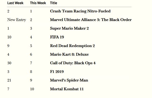 На первое место вернулась гоночная игра Crash Team Racing Nitro-Fueled. На втором месте дебютировал Switch-эксклюзив Marvel Ultimate Alliance 3: The Black Order. Игра стартовала в британской рознице примерно на треть хуже Marvel Ultimate Alliance 2, которая вышла в сентябре 2009 года на Xbox 360, PS3, Wii и NDS. Лидер прошлой недели, Super Mario Maker 2 для Switch, опустился на третье место. Первое и третье место разделяют всего 500 копий.