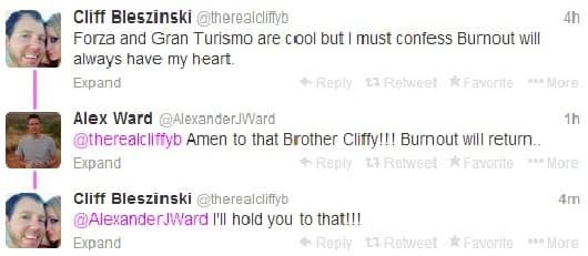 Творческий директор Criterion Games Алекс Уорд (Alexander Ward) ответил ему таким образом: «Аминь, брат Клиффи! Burnout вернется...». Ну а Блезински, в свою очередь, добавил, что он поймал Уорда на слове.