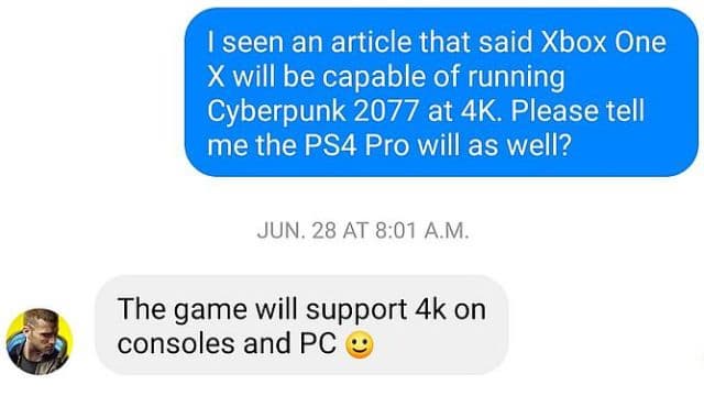 В конце июня мы узнали, что владельцы самой производительной консоли Xbox One X смогут играть в Cyberpunk 2077 в 4K-разрешении. Однако не было понятно какое разрешение будет доступно на PS4 Pro. К счастью, сотрудники студии CD Projekt RED прояснили ситуацию. На вопрос от одного из пользователей Reddit, они рассказали, что игра будет поддерживать 4K-разрешение на обеих консолях и, естественно, на PC.