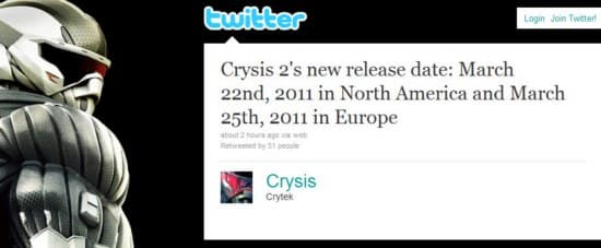 Напомним, проект должен был поступить в продажу осенью этого года, однако недавно было объявлено о переносе даты релиза на 2011. Теперь же ожидается, что в США Crysis 2 поступит в продажу 22 марта, а в Европе - 25 марта 2011 года. Информация была опубликована на официальной twitter-страничке Crytek.